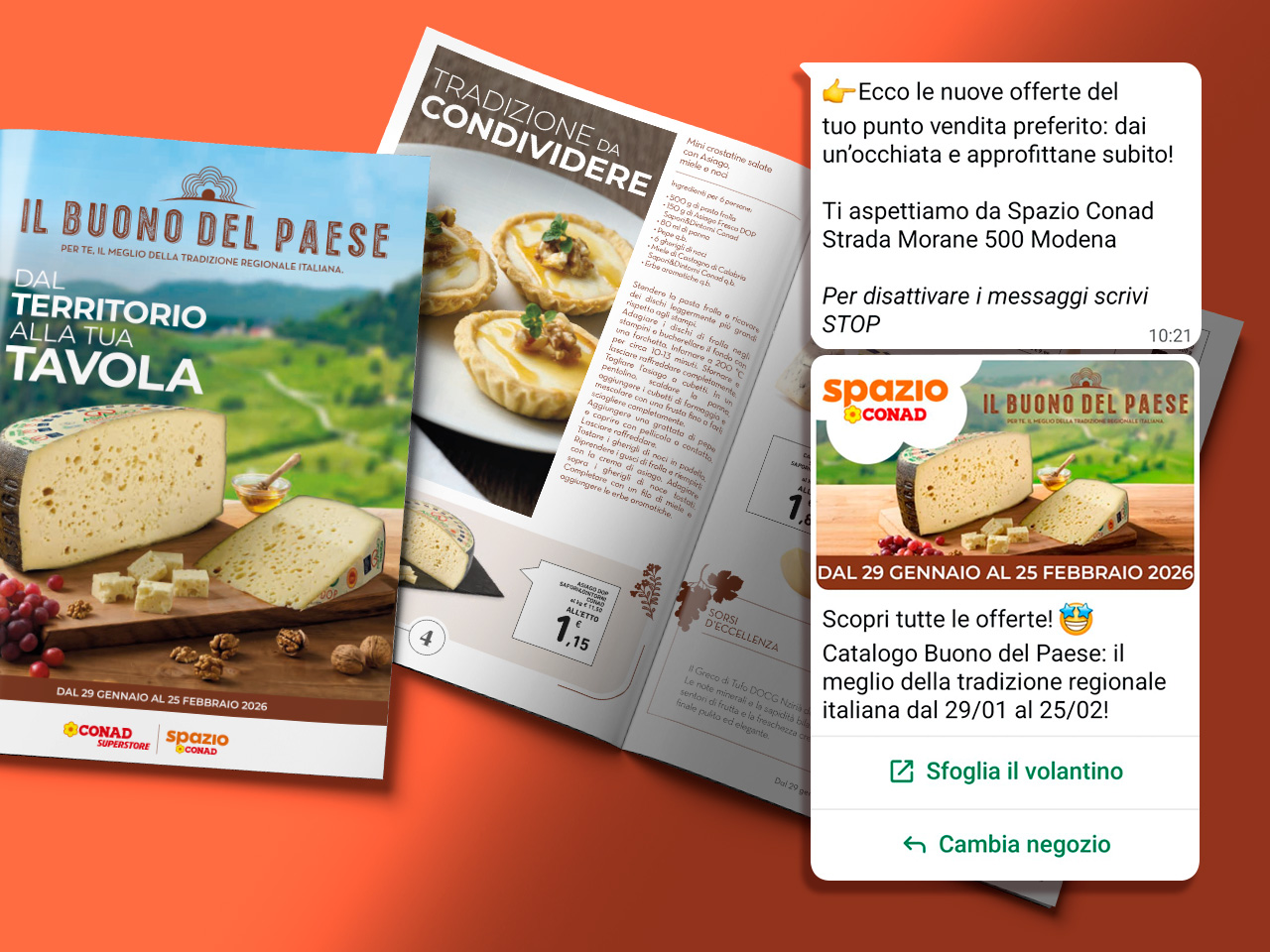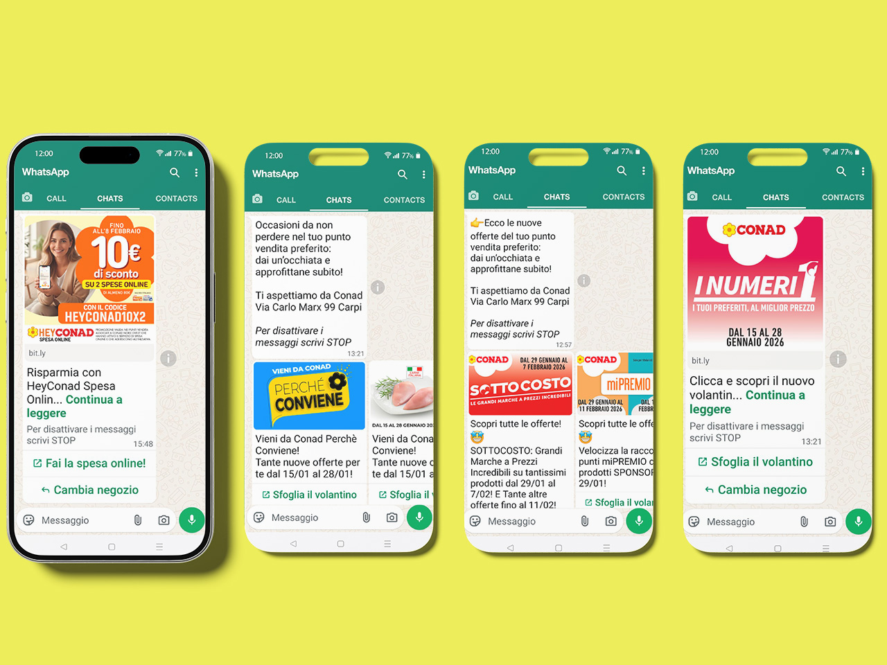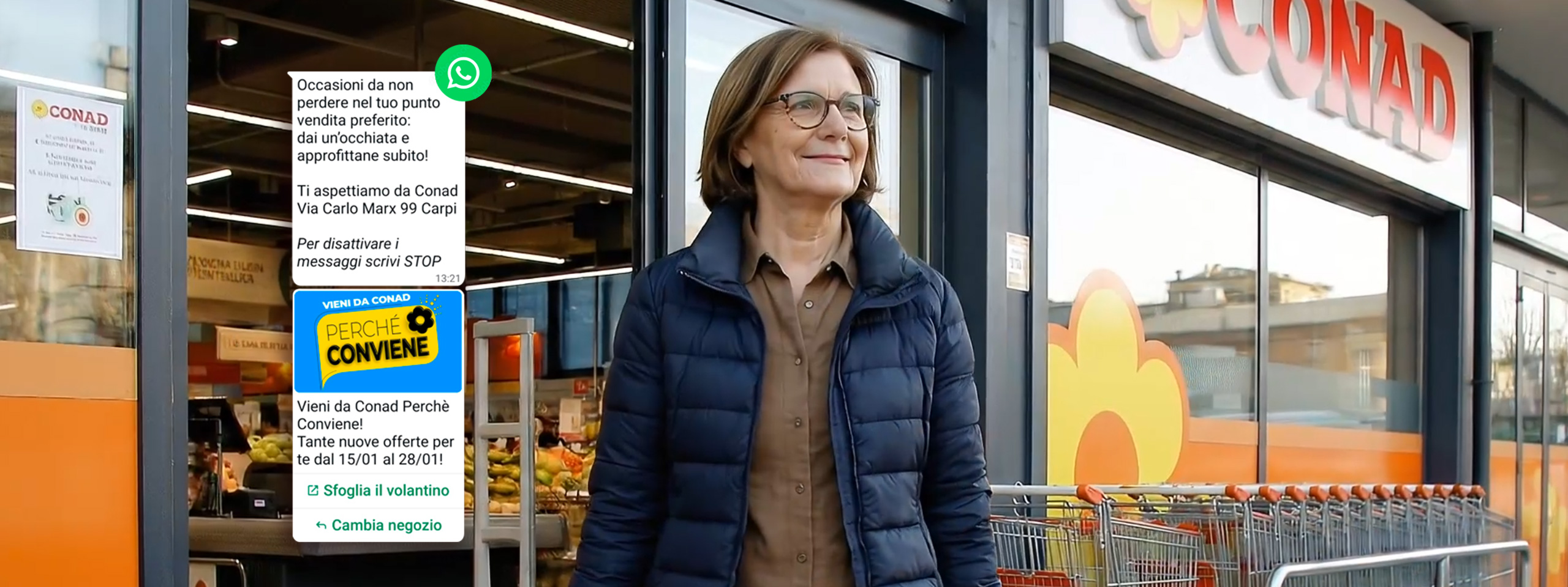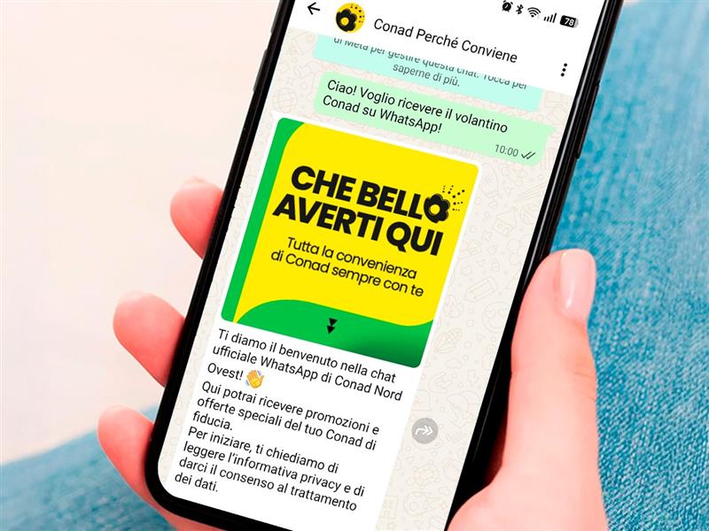 Portare il volantino su Whatsapp tramite la chat dedicata Conad Perché Conviene, offrendo un servizio comodo e informazioni in tempo reale ai consumatori. Un ecosistema che eroga contenuti per 5 canali distributivi – Conad, Superstore, Spazio, City e Pet Store – distribuiti in 7 regioni italiane.