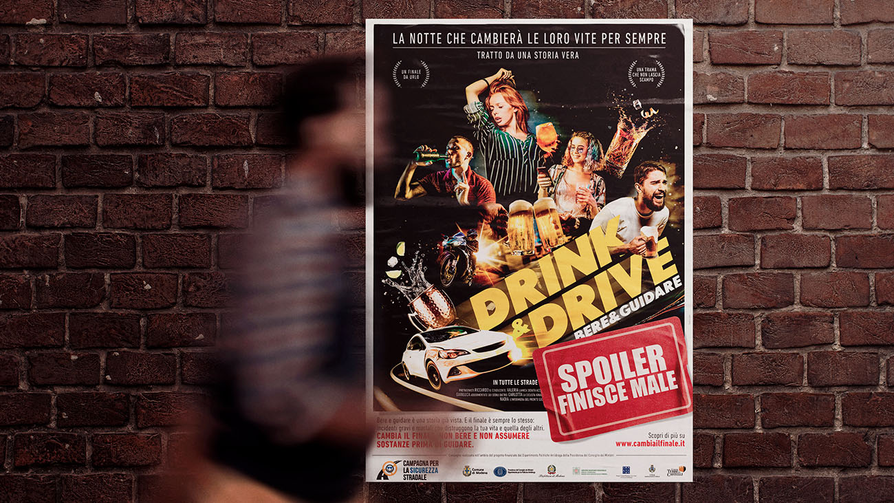 Un “falso” trailer cinematografico per raccontare quella che a tutti gli effetti è una storia già vista: bere e guidare è un film che finisce sempre male. Questo il messaggio della campagna di sensibilizzazione per la sicurezza stradale “Cambia il finale”, che abbiamo realizzato in collaborazione con Comune di Modena, Presidenza del Consiglio dei Ministri – Dipartimento per le Politiche Antidroga, Prefettura di Modena, Azienda Unità Sanitaria Locale di Modena, Unione Comuni Modena Area Nord, Città di Castelfranco Emilia e Unione Terre dei Castelli.